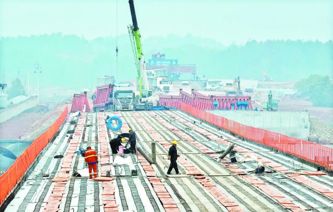 三标六石大桥段,施工人员正加班加点架设30米T梁,路基土石方和桥梁下部构造施工也同步进行。