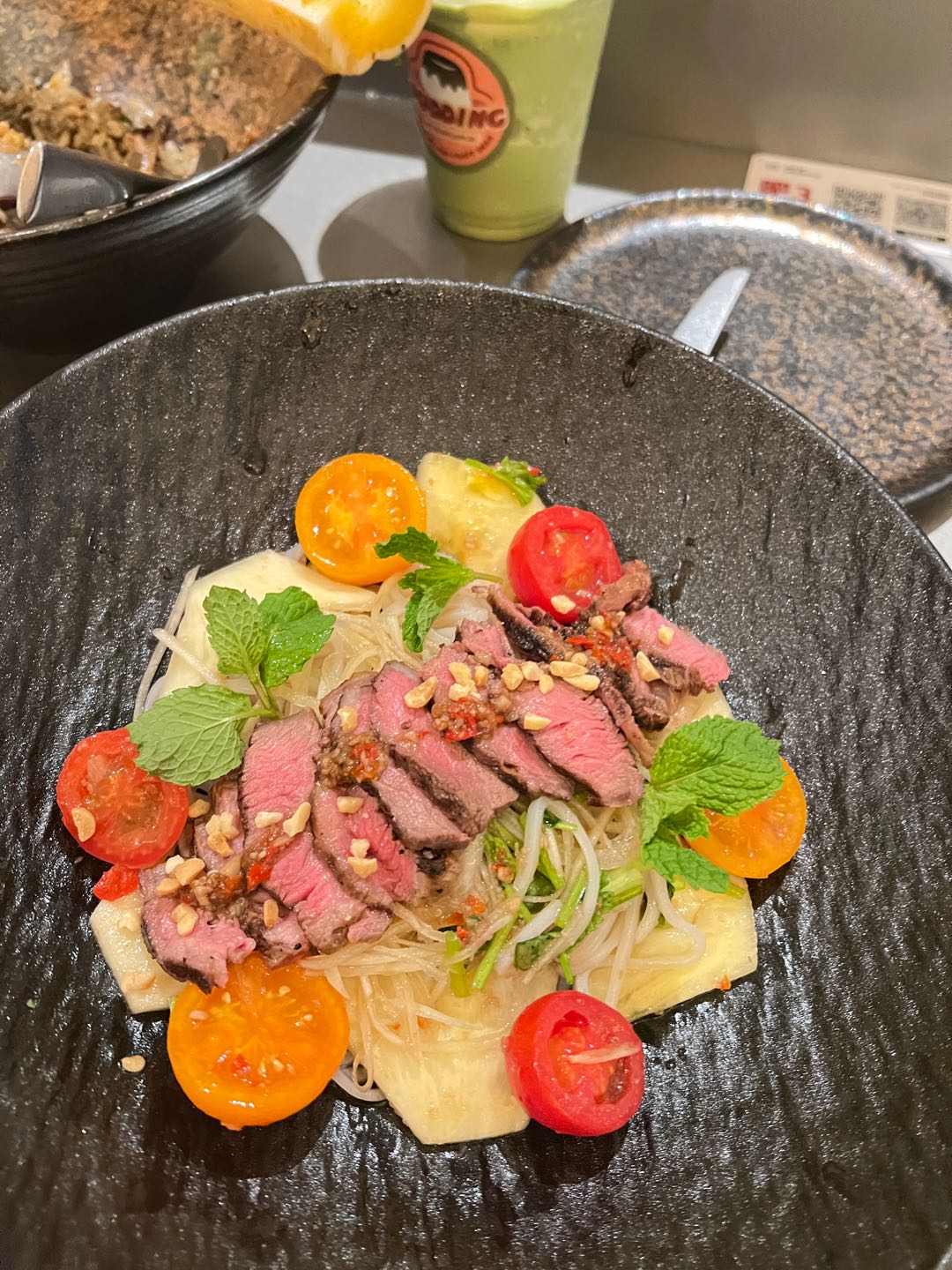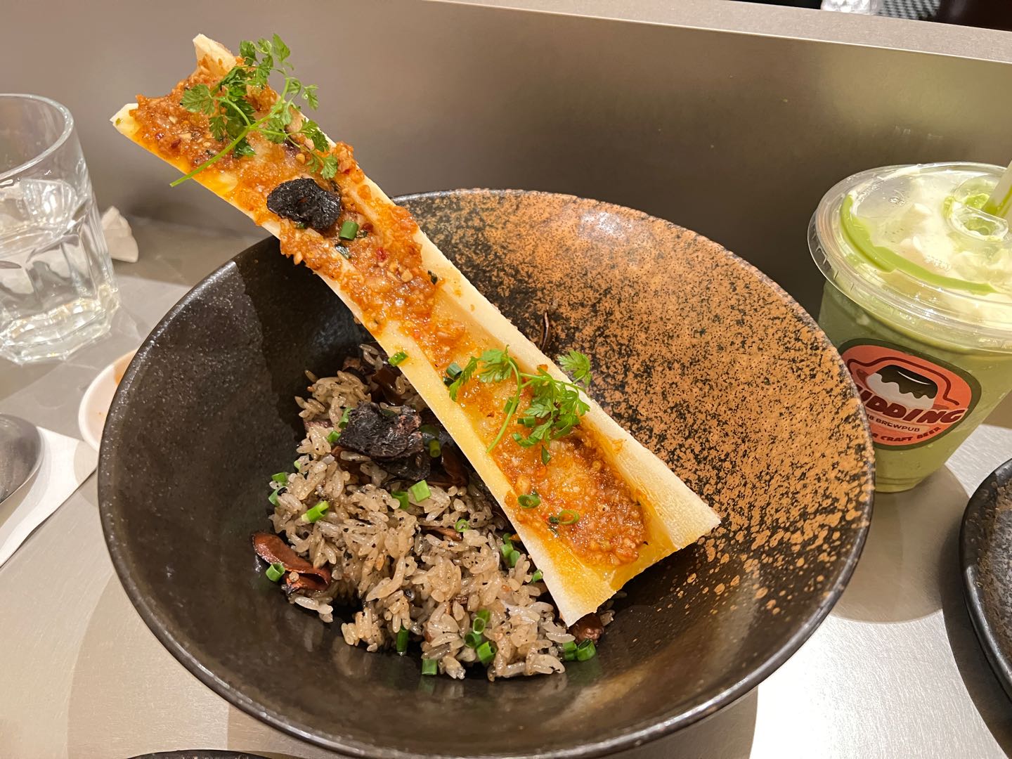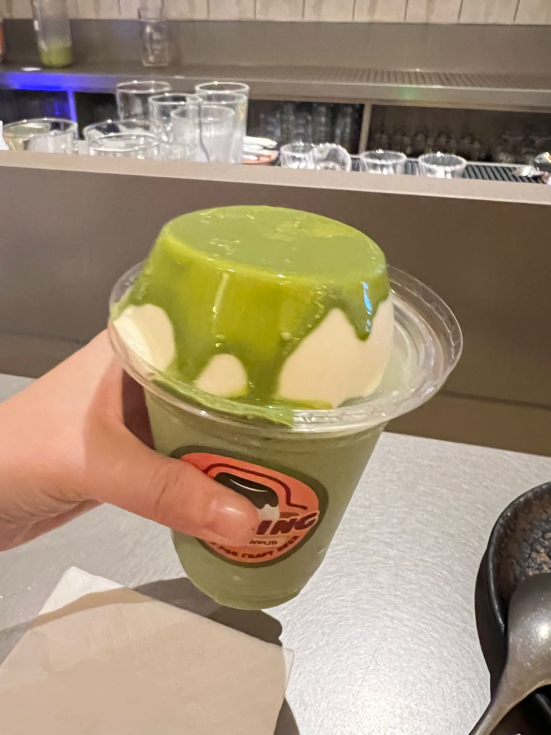 又是很火热的漂亮饭,下班过去已经有人在门口排队,服务员问询我们坐吧台桌是否介意,便果断同意前往吧台。坐下就先点了焦糖奶皮子酸奶蛋糕,显示只剩下3个,口感绵密细腻,甜度合适,喜欢底下部分。牛骨髓黑松露菌菇拌饭,除了份量少一点,其它都不错。越南酸辣牛肉河粉沙拉牛肉很嫩,底部豆芽小番茄带来清爽口感。还有能duangduang的抹茶牛乳奶冻沙冰,抹茶爱好者放心入。<br>