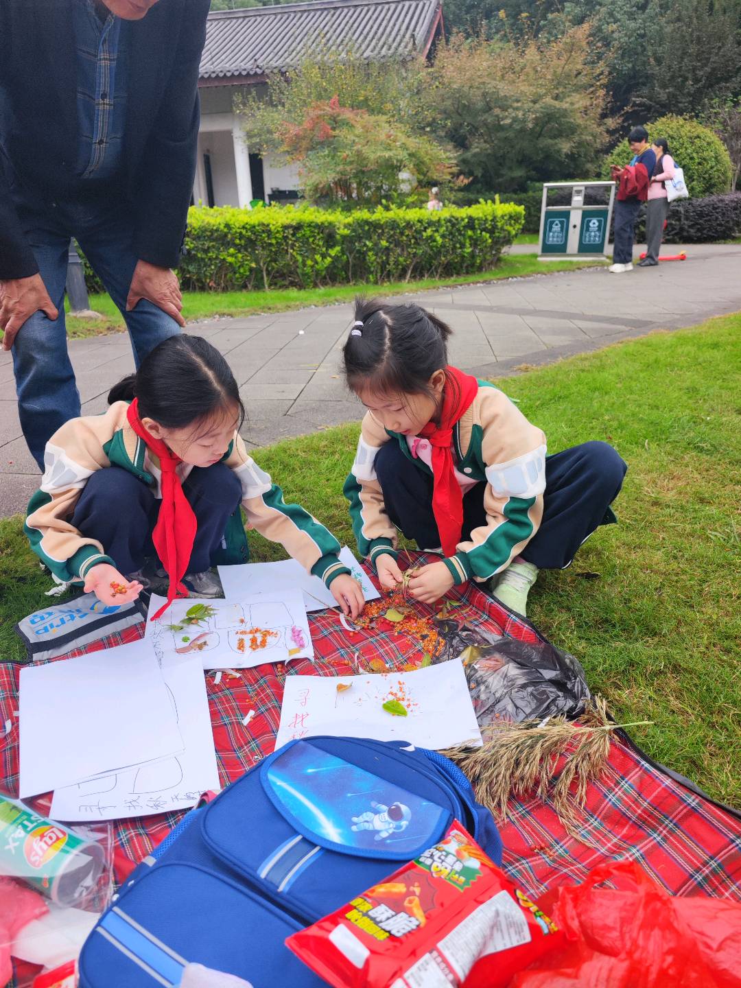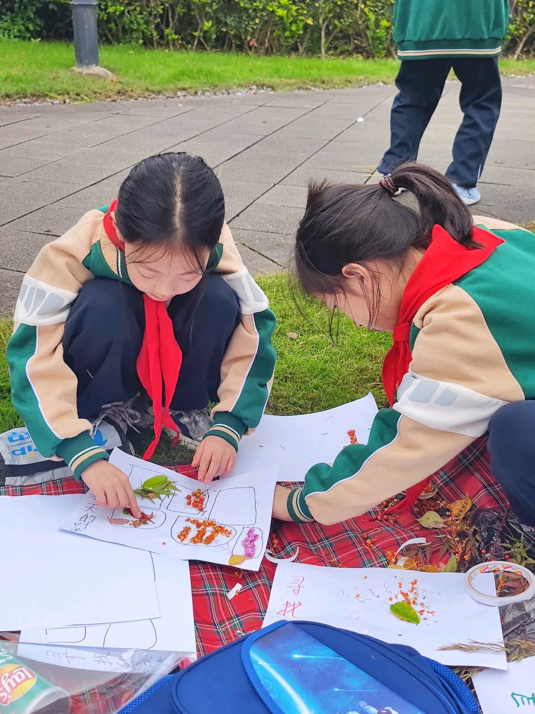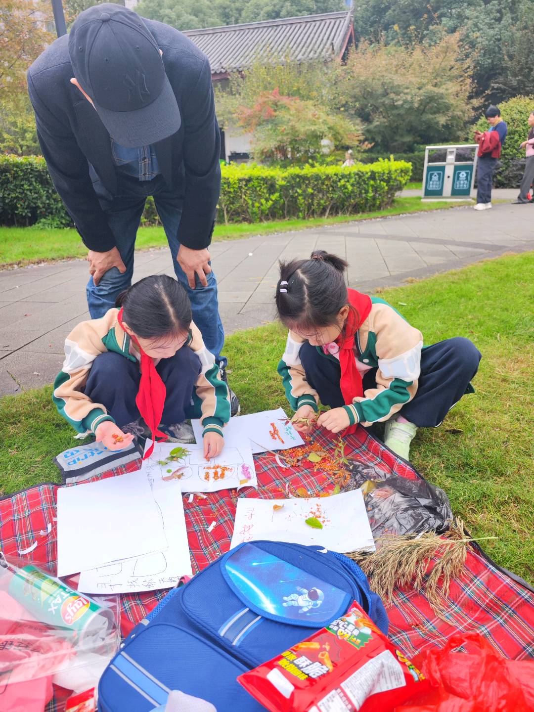 周末遛娃发现的神仙活动!两个穿校服的小妹妹蹲在红黑格子野餐垫上专注做手工,用树叶和花瓣在白纸上拼贴,太有创意啦~