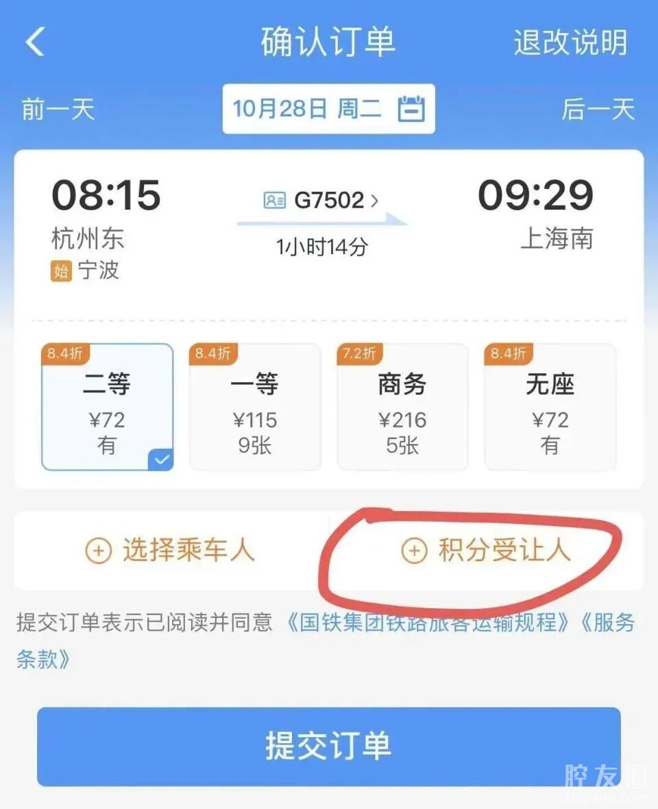 2.在铁路12306App输入需要的乘车区间,确定乘车日期,车次信息处带有“兑”字标识的火车票,就可以使用积分兑换。100积分相当于1元人民币。选择心仪的车次,点击预订后,选择“积分受让人”,按要求填写好身份信息,提交订单后用积分支付即可。