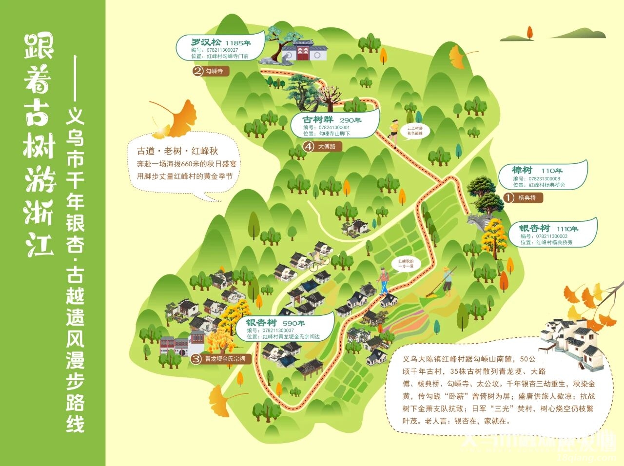 近日,在第五届世界生物圈保护区大会古树名木保护传承边会上,“跟着古树游浙江”12条主题线路正式发布,义乌大陈镇红峰村的千年银杏·古越遗风漫步路线成功入选。