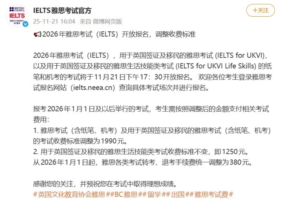 11月21日,@IELTS雅思考试官方发文回应调整收费标准。
