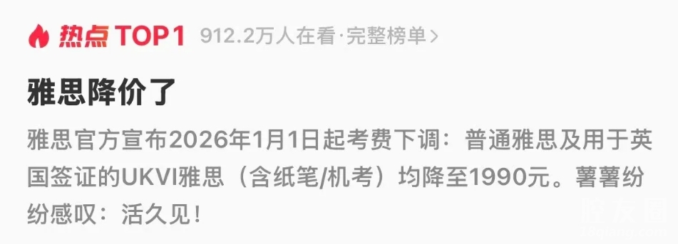 从2026年1月1日起,雅思各类考试转考、退考手续费统一调整为380元。此前,以中国大陆地区为例,2025年普通雅思考试费用为2170元。也就是说,考试费用降价了180元。