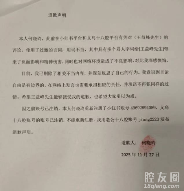 本人何晓玲,此前在小红书平台和义乌十八腔平台有关对(王益峰先生)的评论,使用了过激的言词,用词不当,其中具有多个骂人字词给[王益峰先生]带来了负面影响和精神伤害,同时也对网络环境造成了不良影响,对此我深感懊悔。