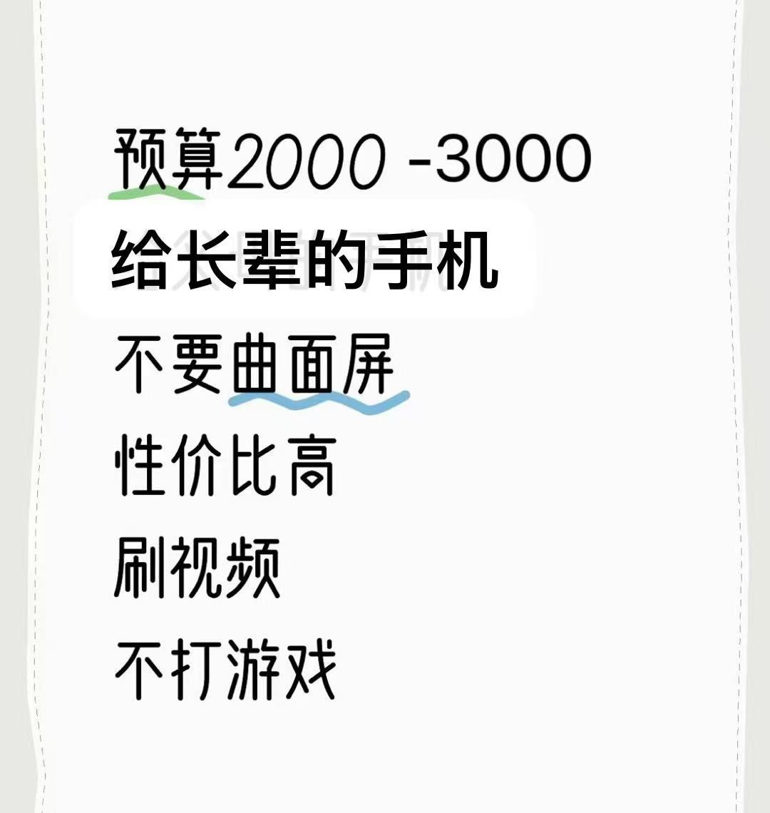 想给婆婆换个新手机,过年当新年礼物,价位在2-3k间,平时就刷刷短视频,发发微信,开开视频,拍拍照有什么推荐的吗?不卡一点,性价比高点的。
