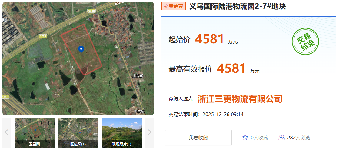 浙江三更物流有限公司以底价4581万元竞得该地块。地块出让面积50007.95㎡(75.012亩),起始价4581万元,竞买保证金4581万元。