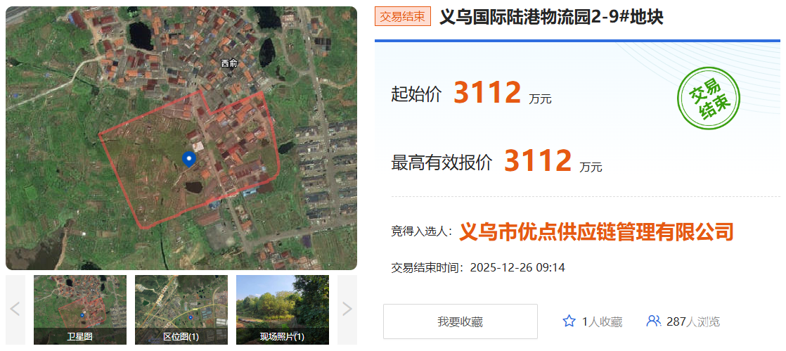 义乌市优点供应链管理有限公司以底价3112万元竞得该地块。地块出让面积34232.45㎡(51.349亩),起始价3112万元,竞买保证金3112万元。
