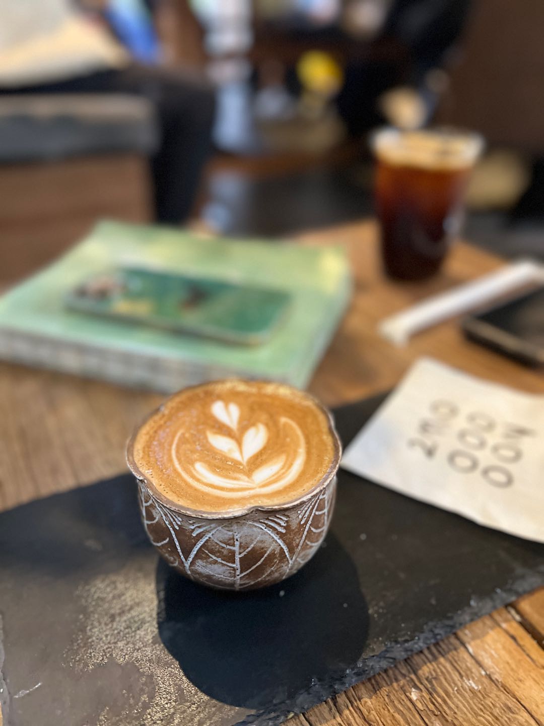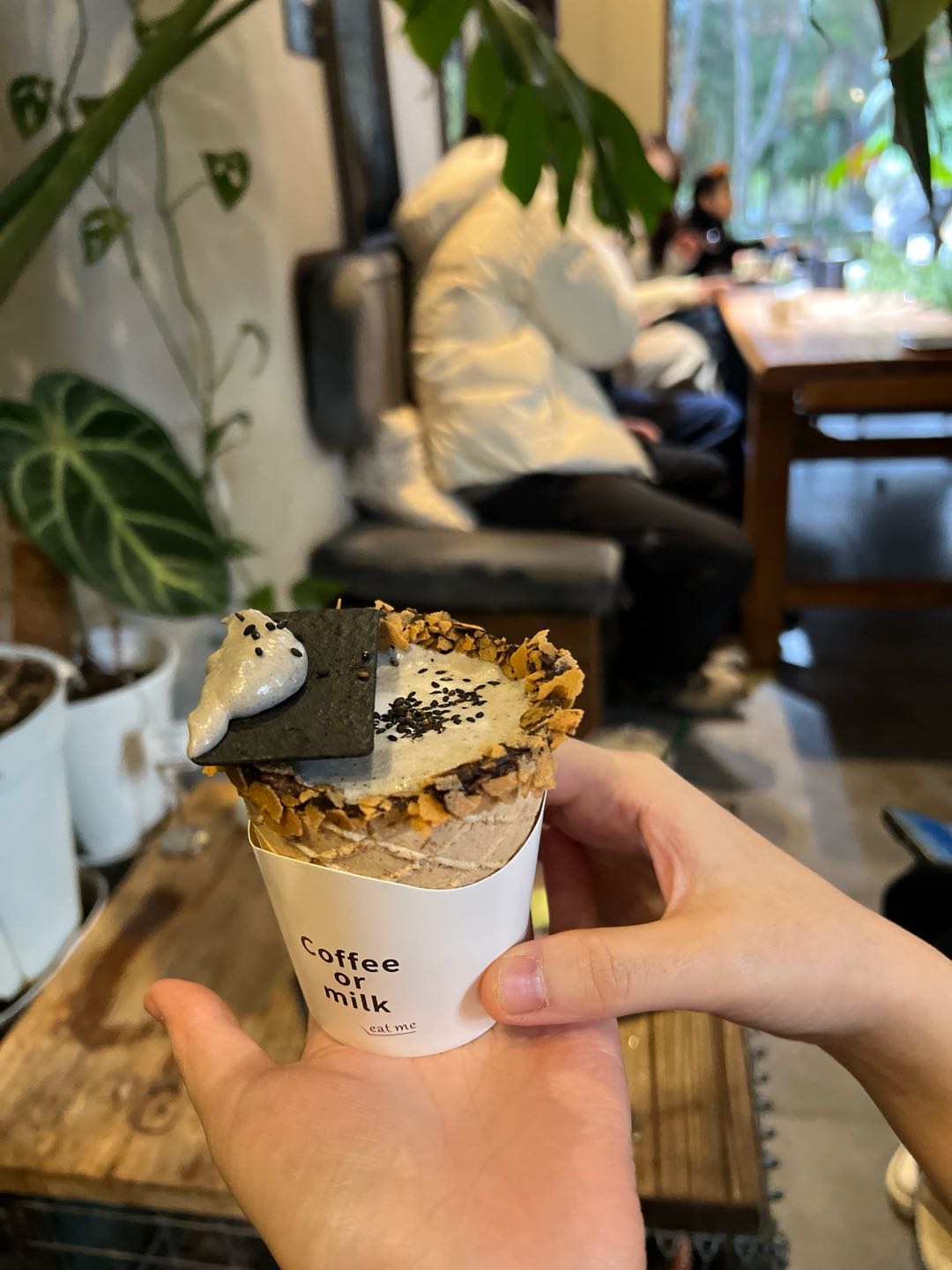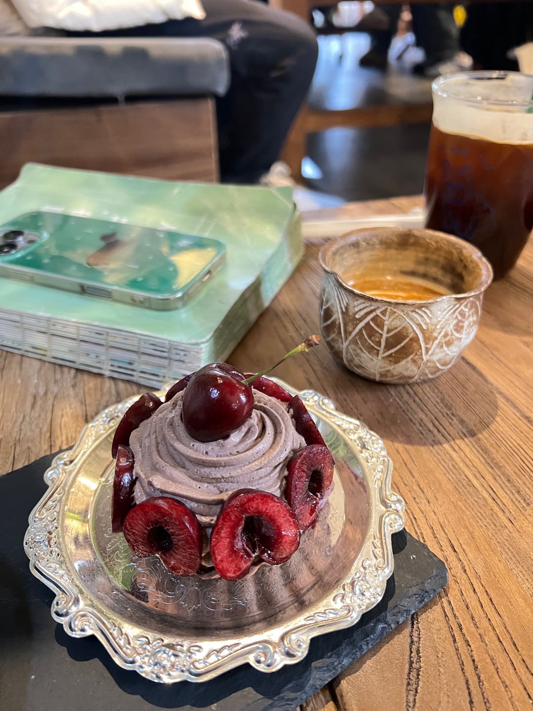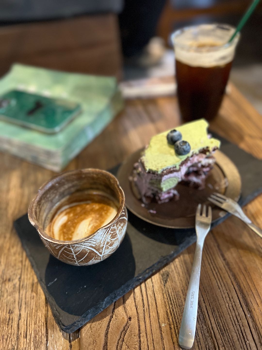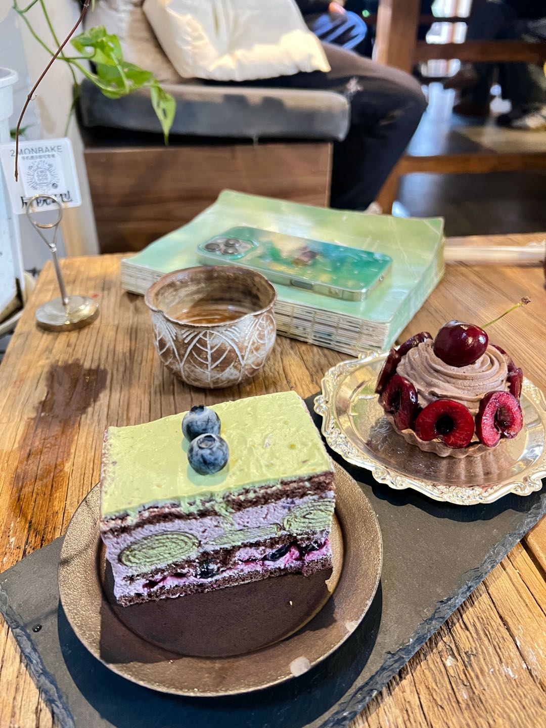 虽然知道人多,但进门还是被人气惊到了。内部不大,满满当当都是人,我们先做在大长桌边等位置。小店的装修风格蛮出片,被各种绿植包围着感觉,后面还有个小院,天晴时候坐着也不错,点了蓝莓开心果卷蛋糕、车厘子千层塔、曲奇咖啡杯,点的甜品味道清醇,搭配咖啡一起还不错。