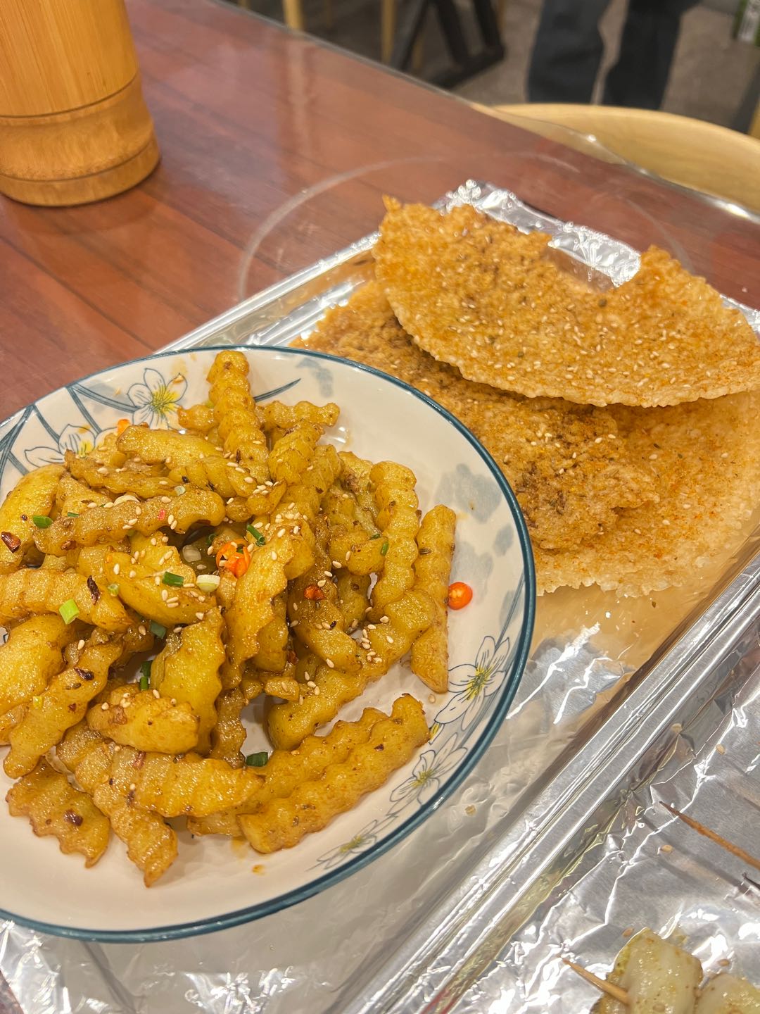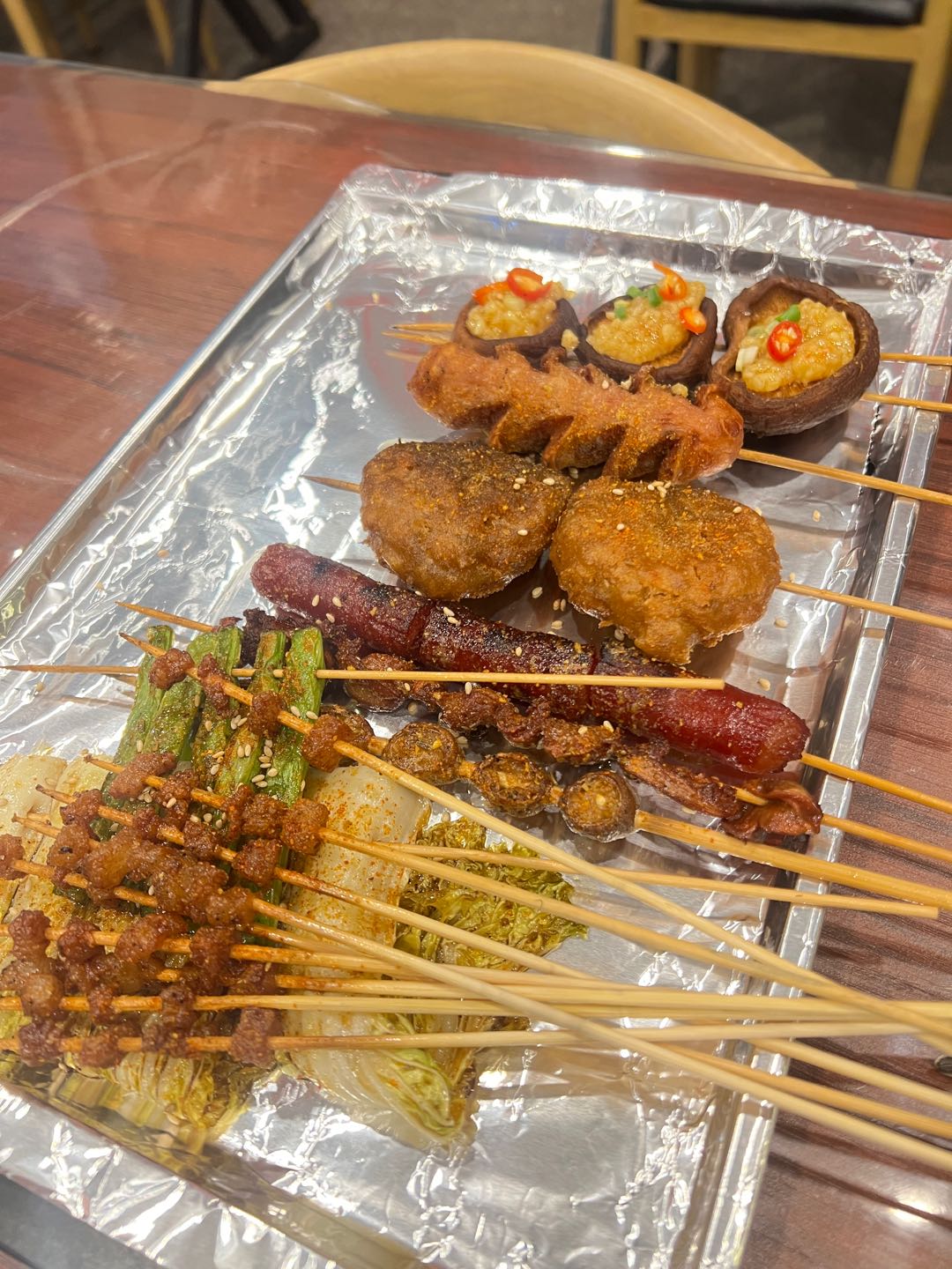 好久没有来撸串了,果断来隔壁烧烤,自从搬到樊村,店的面积大了很多,品种也多了起来。一股脑的各种都来了一些,之前点外卖都会点的狼牙土豆,肉食爱好的纯肉肠,奶香奶香的胸口油,满载蒜蓉的香菇,回忆儿时的锅巴,搭配烤茄子组合成中国版的塔可,出奇的不错。