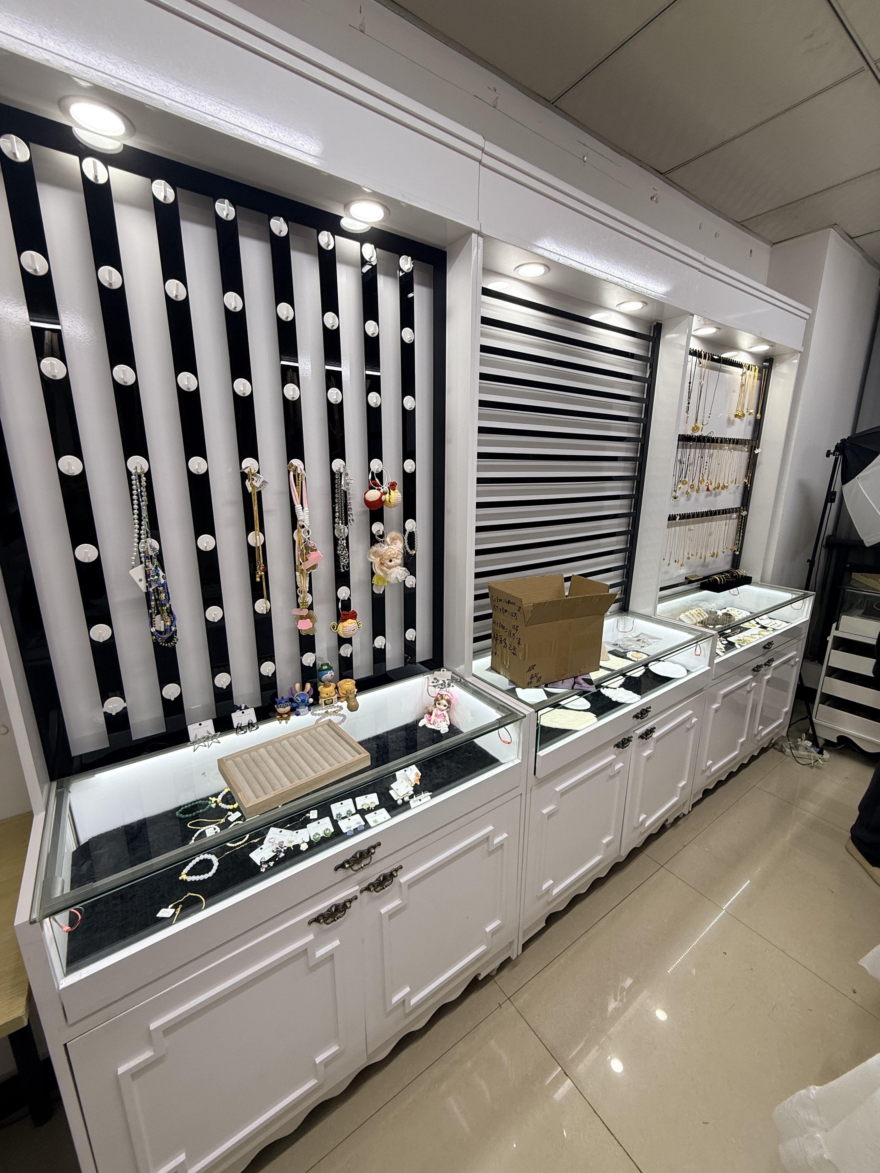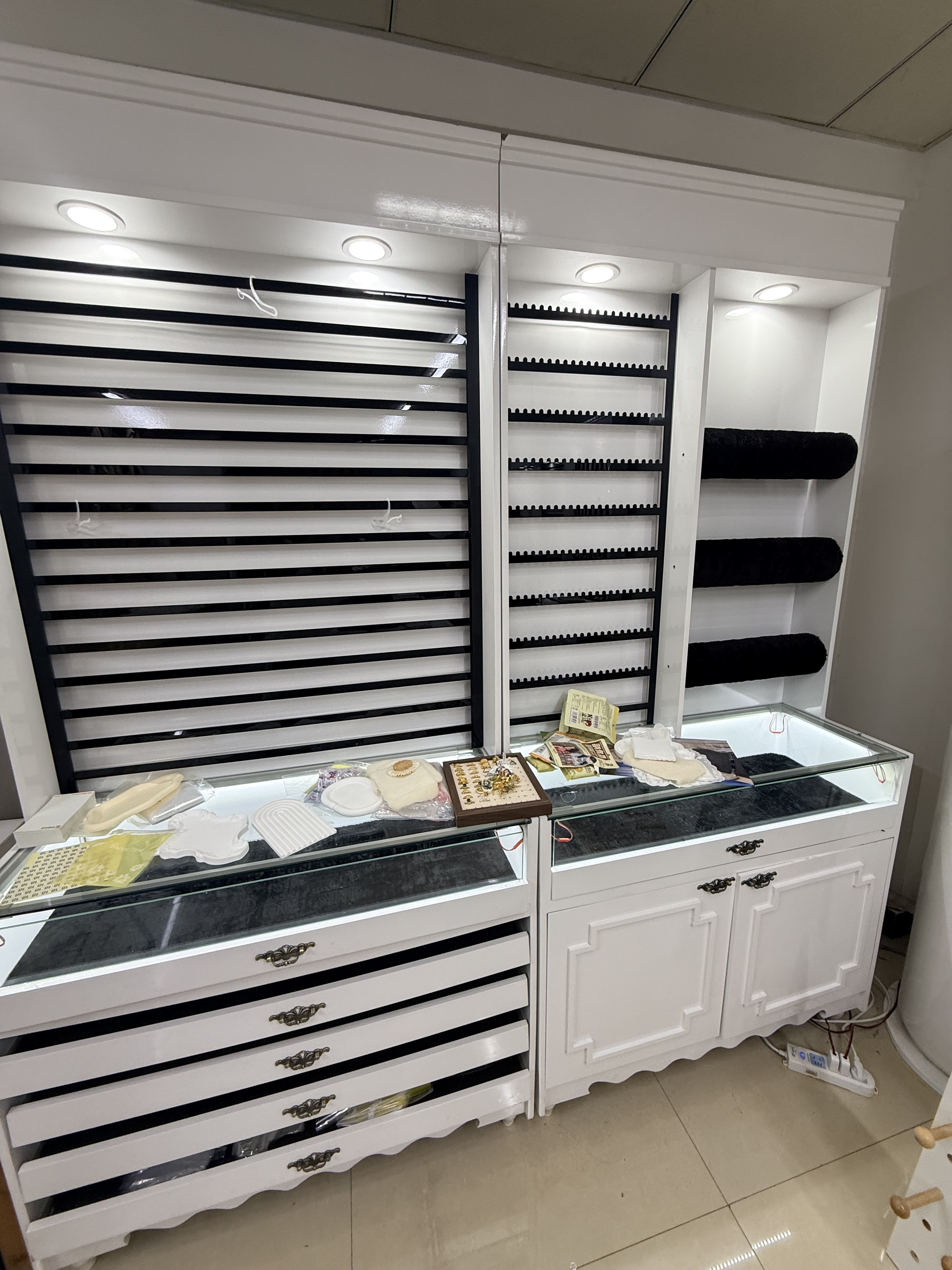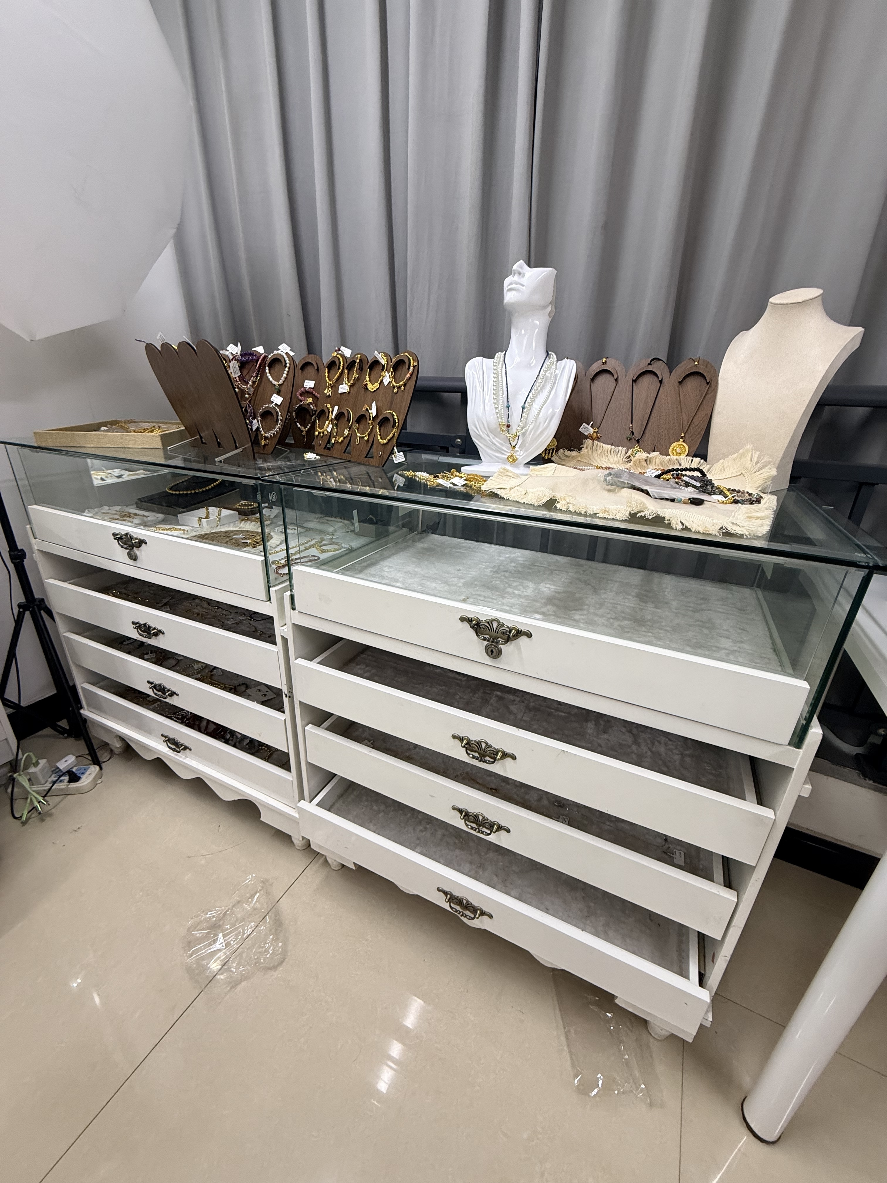 白色欧式展示柜;高柜子500元一个,共5个。小柜子200元一个共2个,带灯,多层抽屉设计