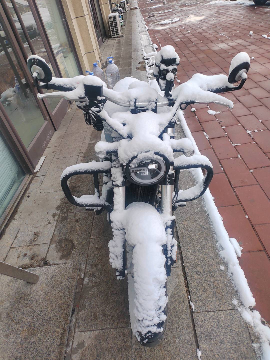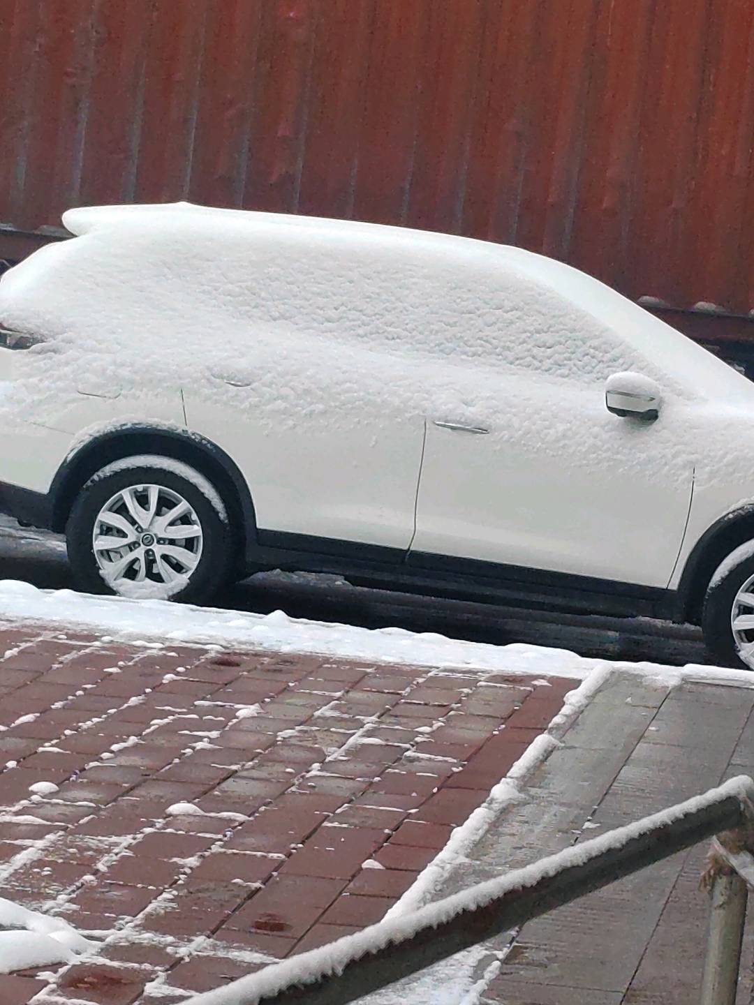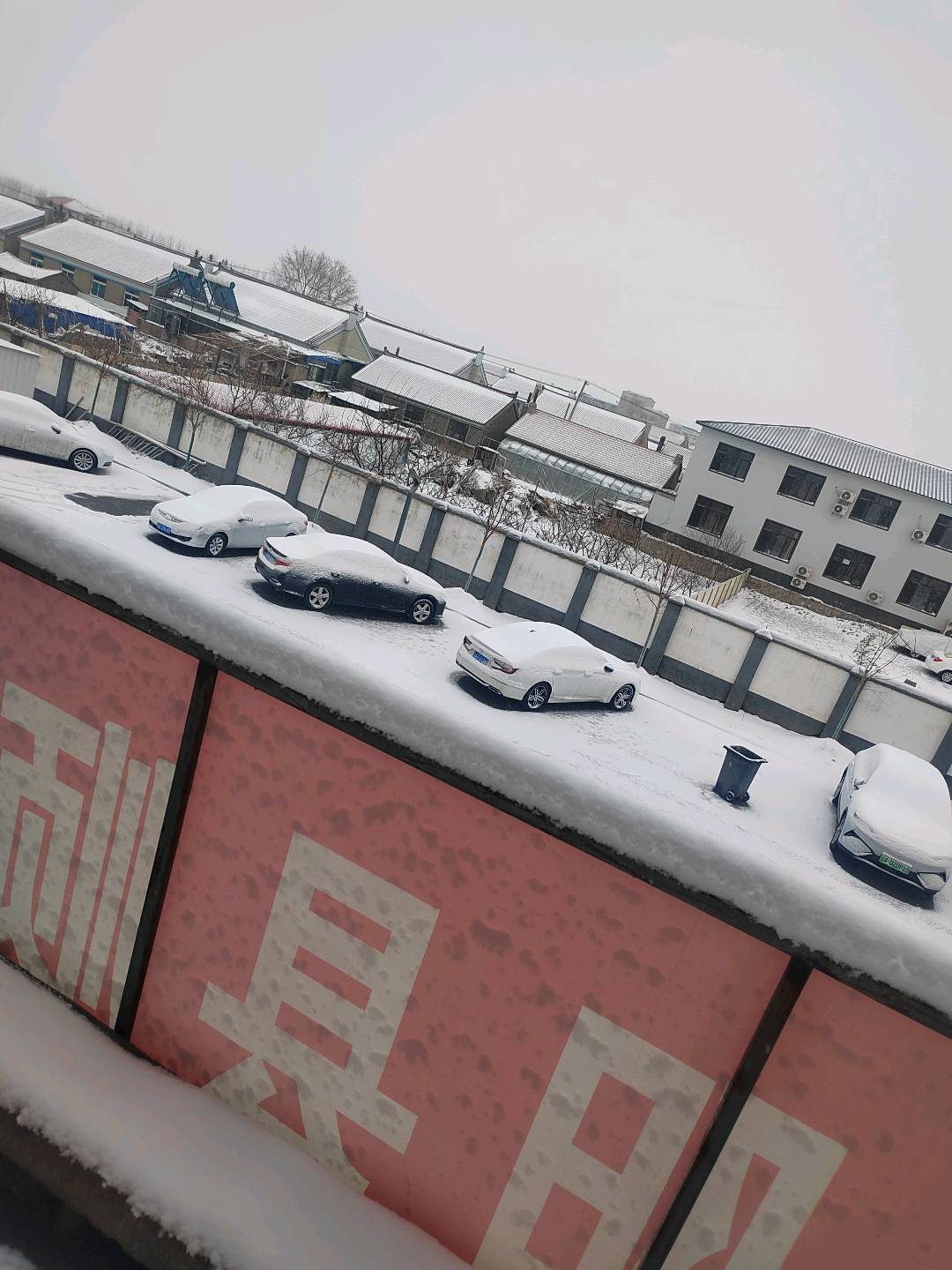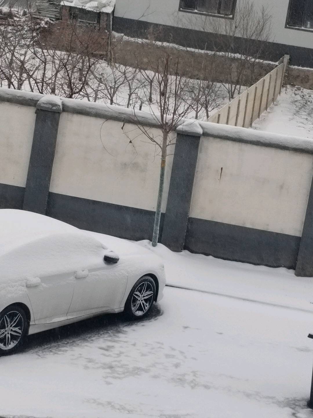 车后方的围墙也披上了雪白外套,中间那棵小树光秃秃挂着黄色保护带,莫名有点可爱!背景里的建筑和栅栏都盖着厚厚的雪,树枝上也挂满了雪絮