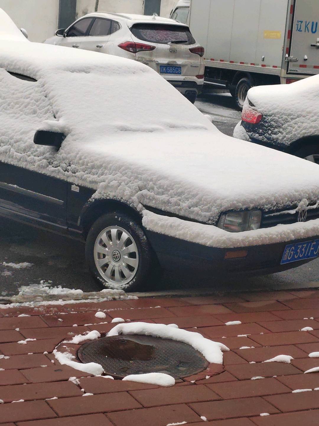 左下角这辆小白车直接被雪埋住,只露出一点点轮廓和银色的轮毂