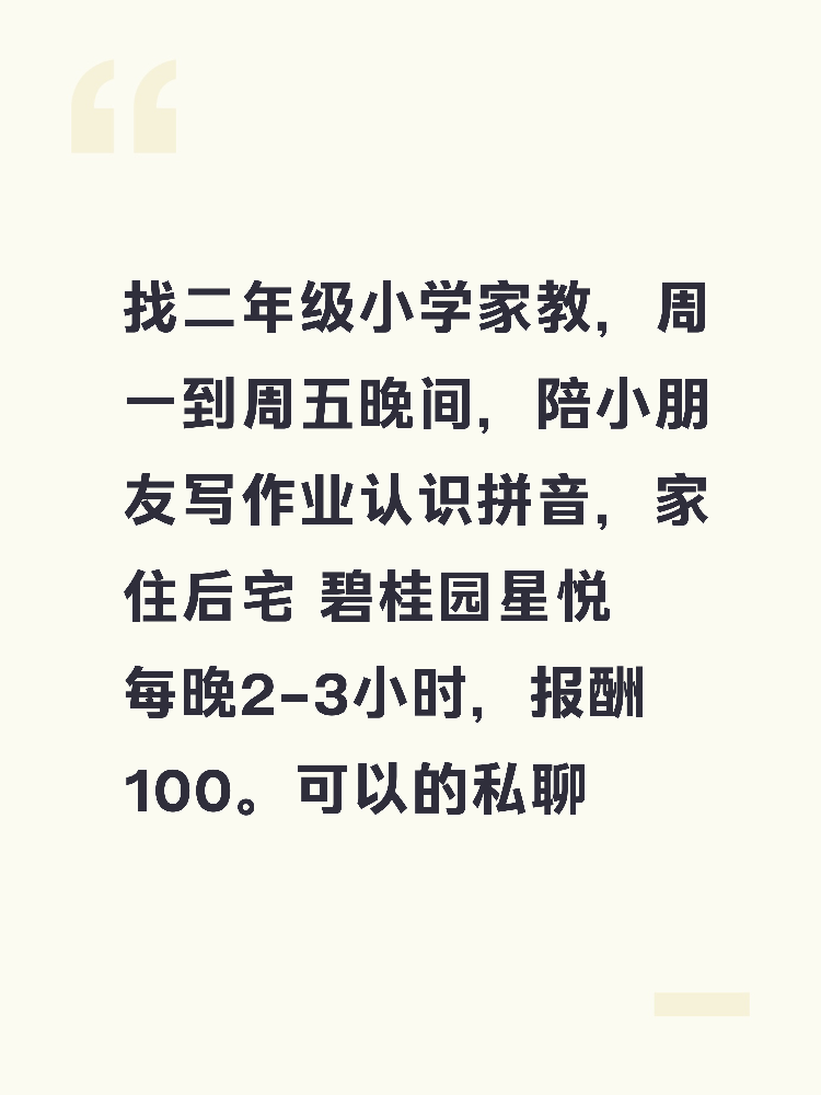 ,家住后宅 碧桂园星悦 每晚2–3小时,报酬百元/晚,有意可私信详聊~