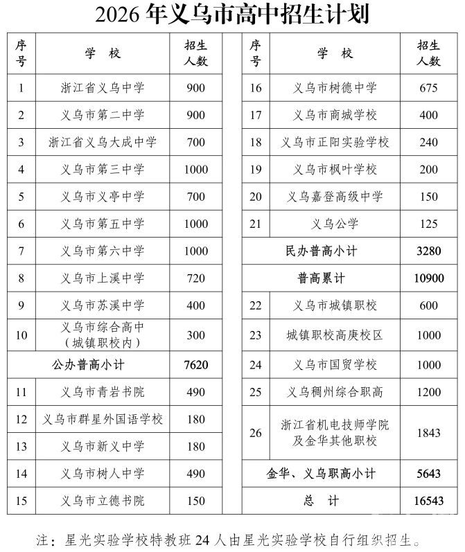 2026年秋季新增义乌市苏溪中学、义乌市综合高中(城镇职校内)、城镇职校高庚校区三所公办学校。与2025年招生计划相比,义乌二中和义乌三中各增加100人、上溪中学增加90人,公办普通高中招生计划占比提高2%,总数创历年新高。